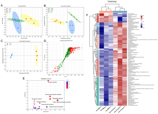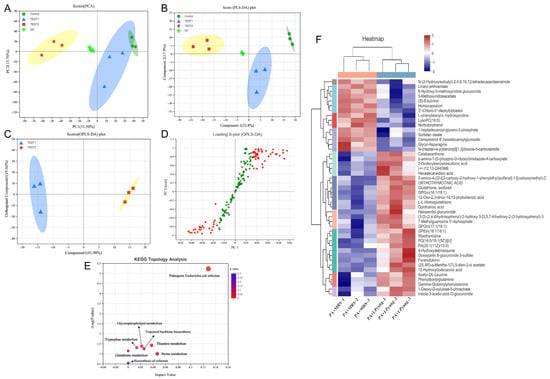 Metabolome analysis of P. aeruginosa culture with LPyang in ESI− mode. (A) PCA, (B) PLS-DA, (C) OPLS-DA score plot; (D) S-loading plot based on OPLS-DA analysis; (E) heat map of liver metabolites with significant intergroup differences (VIP value > 1.0, p < 0.05) between MRS-negative control and LPyang-treated groups; (F) metabolic pathway prediction based on the KEGG database.