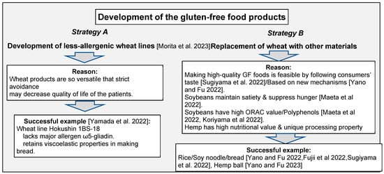 Extensive and long-term efforts on wheat breeding [1] have made wheat flour a useful material in making bread, noodles, and other various foods worldwide [2]. Nowadays, wheat is regarded as one of the representative food ingredients, and the great versatility of wheat gluten has made it difficult for consumers to find food devoid of any gluten. However, due to the prevalence of celiac disease/wheat allergy, as well as the changing dietary lifestyle, the demand for gluten-free foods is expanding [3]. This Special Issue called for papers written in view of the strategies to develop high-quality gluten-free food products that meet the demands of consumers. Herein, five articles/communication papers and three reviews/perspectives cover a broad spectrum of information, categorized into two major key strategies (Figure 1):