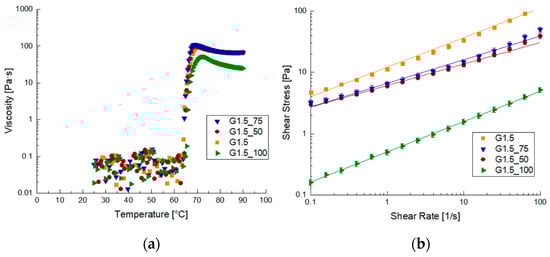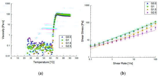 The FFS was prepared and characterized using rheological methods. In Figure 1, the rheological results are shown in terms of viscosity vs. temperature and viscosity vs. shear rate at 40 °C. It is possible to observe that increasing temperature increased the viscosity of all the samples because of the gelatinization reaction (Figure 1a). All the samples reached the maximum viscosity at about 70 °C and differences in the viscosity value were not appreciable.