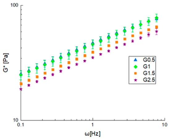 Frequency sweep tests were performed on the prepared gels in linearity, and the results are reported in terms of complex modulus (G*) shown in Figure 2, while the angle phase (δ) with a value of 25 ± 2 was not plotted because it is independent on both the glycerol content or the frequency. The gel consistency decreased as the amount of glycerol used increased, while the structuring of the material seemed to be scarcely affected by this, as confirmed by the phase angle values that are very similar to each other. All gels were found to have a solid-like behavior with phase angle values around 25°.