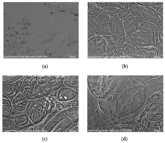 The surface morphology of the film was observed using a scanning electron microscope (FlexSEM 1000 II, HITACHI, Tokyo, Japan). The samples were allocated on double-sided adhesive carbon tabs, positioned on an aluminum sample stub. All pictures were acquired in low-vacuum conditions (50 Pa) using the BSE-COMP signal, with an accelerating voltage of 15 kV and a working distance of 6.5–6.9 mm [28]. Morphological analysis was carried out at 400× magnifications.