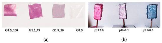 G1.5_100, G1.5_75, G1.5_50, and G1.5 samples after casting (a) and after coating at pH = 3.8, pH = 6.1, and pH = 8.3 (b).
