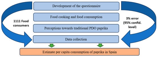 To date, this is the most comprehensive study on paprika consumption—either smoked or unsmoked—that has been carried out, since this product, due to its consumption levels, is usually included with other flavourings or spices. The study was carried out on the basis of one year’s consumption to avoid seasonal fluctuations, and the data presented correspond to the average of the surveys. Figure 1 summarises the methodological process followed in this research.
