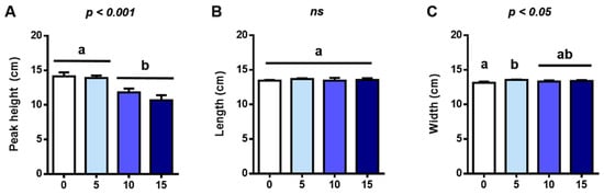 Effects of different replacement levels (%) of flour by FFP on the (A) peak height, (B) length, and (C) width of bread loaves. Different letters indicate significant differences (p < 0.05 and p < 0.001). FFP: Fermented food product.