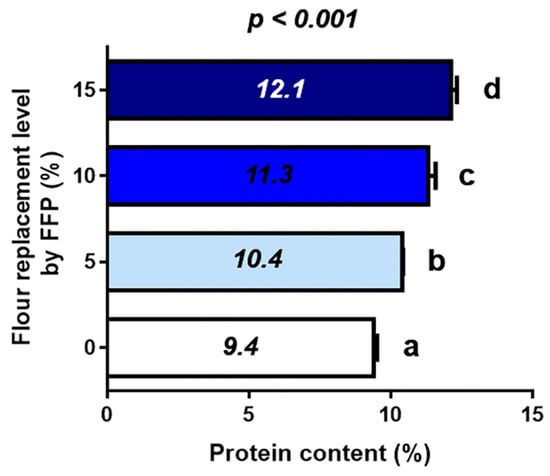 Regardless of its vegetal origin, FFP has a relatively high contribution of protein (44.5%). As expected, we found that the protein content in Bread-0 (9.4%) increased with the incorporation of FFP, reaching 10.4, 11.3 and 12.1% of protein content in Bread-5, Bread-10, and Bread-15, respectively. This indicated that even the lowest FFP supplementation significantly increased the protein content of the bread loaves (p < 0.001) (Figure 4). A similar trend was previously reported for Barbari bread supplemented with different levels of DDGS [34].