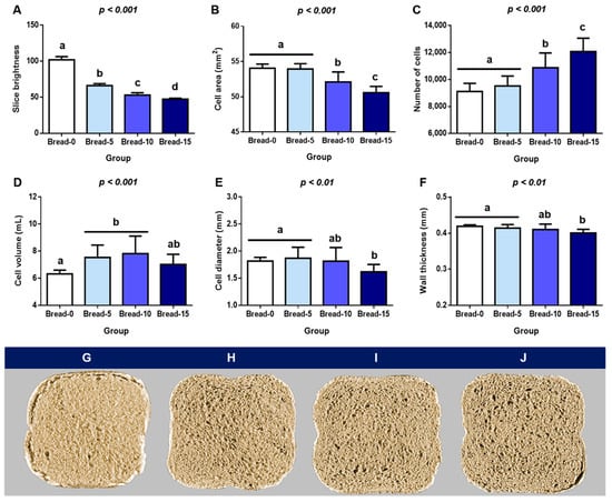 Cell volume increased in Bread-5 and Bread-10, while Bread-15 remained similar to the control (Bread-0) (Figure 5D; p < 0.001). The incorporation of FFP had a different effect on cell diameter and wall thickness, which were significantly reduced at replacement levels of 15% (Figure 5E,F; p < 0.01). No significant linear correlation was identified between cell volume and cell diameter (ρ = 0.40; p > 0.05) and wall thickness (ρ = 0.22; p > 0.05). A previous study investigated the impact of different replacement levels of breadfruit flour on bread quality parameters [61], and the authors also found a negative impact of this ingredient on slide area, cell diameter, and wall thickness. Contrary to our results, these treatments positively affected the cell volume.