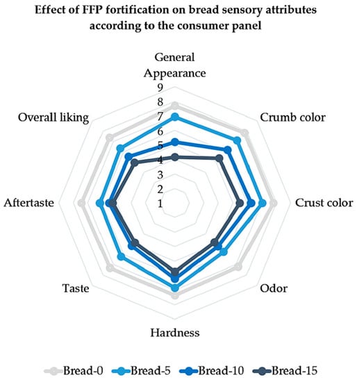 Table 3 presents the mean data from the consumer panel evaluations and Figure 6 helps visualize the sensory study results. Overall, we found significant differences between the groups for all the sensory characteristics tested (all p < 0.001). The control (Bread-0) was liked significantly more in all the sensory parameters than the other experimental bread groups (Bread-5, Bread-10, and Bread-15), and obtained the best scores in general appearance and overall liking. Besides that, most scores were equal to or greater than 5 in all the parameters and groups, except for the general appearance in Bread-15 (4.1, “Just a little bad”). We can conclude that adding FFP to bread affected consumer evaluation, but consumers still accepted all products. When the mean scores were calculated for all parameters, the best punctuation (7.8, “Very good”) was registered for both crumb and crust color in Bread-0.