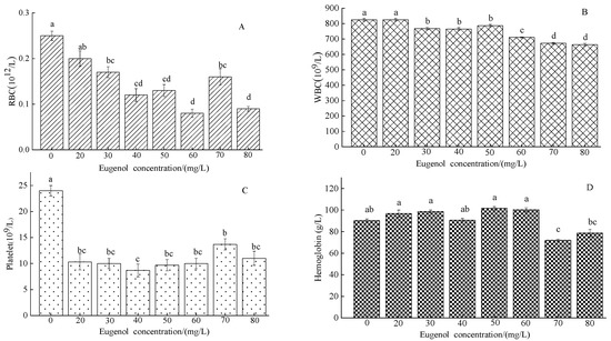 Changes in RBC, WBC, PLT, and HGB in crucian carp anesthetized with different concentrations of eugenol. The same lowercase letter in the graph indicates an insignificant difference (p > 0.05), whereas different lowercase letters indicate a significant difference (p < 0.05). Note: (A)—RBC, (B)—WBC, (C)—PLT, (D)—HGB.