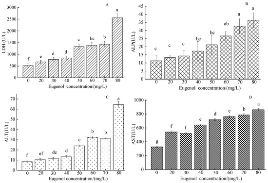 After eugenol anesthesia, the concentration of LDH in each experimental group was higher than that in the control group (Figure 2A). The LDH content in the control group was 531.67 ± 13.67 U/L, and the highest LDH in the 80 mg/L group was 2560 ± 17 U/L. A significant difference was observed between the experimental group and the control group (p < 0.05). With increasing eugenol concentration, the content of ALP gradually increased (Figure 2B). The concentration of ALP in the control group was 11.32 ± 3.46 U/L. A significant difference was observed between the control group and the 60, 70, and 80 mg/L test groups (p < 0.05) but not between the other experimental groups (p > 0.05). The content of ALT in the control group was 8.7 ± 0.61 U/L (Figure 2C). The content of ALT in each experimental group was higher than that in the control group, except for that in the 20 mg/L group, which significantly differed from that in the control group (p < 0.05). The content of aspartate aminotransferase (AST) in the control group was 326.83 ± 12.16 U/L, whereas that in each experimental group was significantly higher (p < 0.05).
