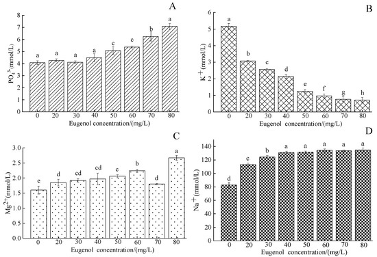 Changes in serum PO43−, K+, Mg2+, and Na+ content in crucian carp after anesthesia with different concentrations of eugenol. Notes: (A)—PO43−, (B)—K+, (C)—Mg2+, (D)—Na+. The same lowercase letter in the graph indicates an insignificant difference (p > 0.05), whereas different lowercase letters indicate a significant difference (p < 0.05).