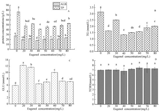 Changes in serum ALB, TP, TG, GLU, and TCHO in crucian carp after anesthesia with different concentrations of eugenol. Notes: (A)—ALB, TP, (B)—TG, (C)—GLU, (D)—TCHO. The same lowercase letter in the graph indicates an insignificant difference (p > 0.05), whereas different lowercase letters indicate a significant difference (p < 0.05).