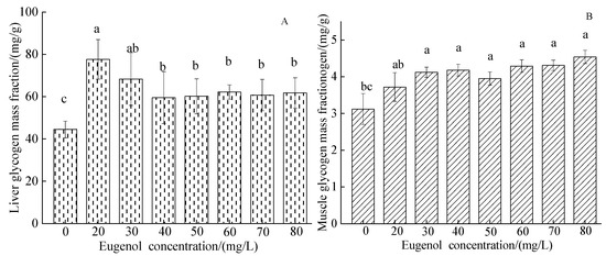 Changes in liver and muscle glycogen mass fraction content in crucian carp after anesthesia with different concentrations of eugenol. Notes: (A)—liver glycogen mass fraction, (B)—muscle glycogen mass fraction. The same lowercase letter in the graph indicates an insignificant difference (p > 0.05), whereas different lowercase letters indicate a significant difference (p < 0.05).