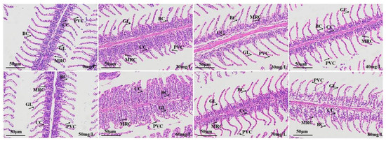 The gill tissue sections of the control group and carp anesthetized with different concentrations of eugenol are shown in Figure 6. In contrast with the control group, the 20, 60, 70, and 80 mg/L eugenol-treated groups showed edema and elevation of the gill lamellae, which were not neatly arranged (neither perpendicular to the gill filaments nor parallel to one another), and the bases of the gill lamellae were elevated and not smooth. The mitochondria-rich cells were smoothly distributed at the base of the gill lamellae, with no clear elevation or detachment; the flat epithelial cells were neatly arranged on the gill lamellae; and the overall structure showed normal physiology.