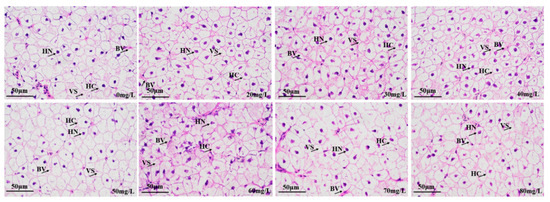 Effects of eugenol anesthesia on the histological structure of the liver in crucian carp. Note: VS: vacuoles; HC: hepatocytes; HN: hepatocyte nucleus; BV: blood vessels.
