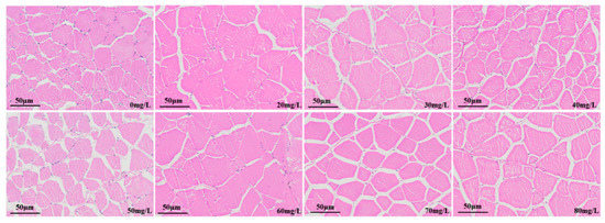 The muscle tissue sections of the control group and the group anesthetised with different concentrations of eugenol are shown in Figure 8. Muscle is composed of many muscle fibers. In the control group, the muscle fibers were closely arranged. The muscle fiber sizes among the concentration groups differed, the muscle fiber arrangement was disordered, and the muscle fiber diameter was significantly smaller than that in the control group. In the 20–80 mg/L concentration group, the muscle fiber gap was further widened, the muscle fiber was disordered, and a clear fracture phenomenon occurred.