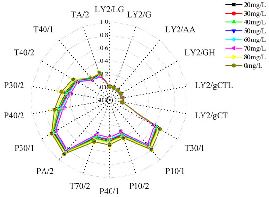 Radar fingerprints of the effect of muscle flavour in the control group and the group anaesthetised with different concentrations of eugenol are shown in Figure 9. The aroma of muscle tissue from crucian carp anesthetized with different concentrations of eugenol was analyzed with an electronic nose. A radar map was constructed to reflect the effects of different concentrations of eugenol on volatile components in muscle. The 18 sensors of the FOX4000 electronic nose differ in their sensitivity to gas. When the sensor is in contact with gas, the ratio of relative conductivity G/G0 is proportional to the gas concentration. When G/G0 > 1, the gas concentration is high. When G/G0 ≤ 1, there is no response gas, or the gas concentration is below the detection limit [27]. As shown in Figure 6, the 18 sensors of the electronic nose responded to different concentrations of eugenol among the volatile flavor substances of crucian carp muscle, and the response intensity differed. The G/G0 of T30/1, P10/1, PA/2, P30/1, and P40/2 sensors was higher than that of the other sensors. The concentration of eugenol in the control group was higher than that in all experimental groups except the 80 mg/L group. The effects of eugenol on the muscle in crucian carp in the other experimental groups were unclear, and the difference in the response signal intensity was small. The principal component analysis diagram can be visually distinguished.