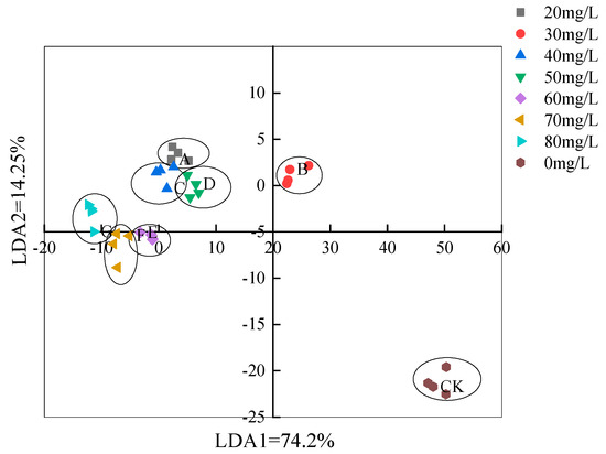 LDA analysis based on the electronic nose method. Note: CK: 0 mg/L, A: 20 mg/L, B: 30 mg/L, C: 40 mg/L, D: 50 mg/L, E: 60 mg/L, F: 70 mg/L, G: 80 mg/L.