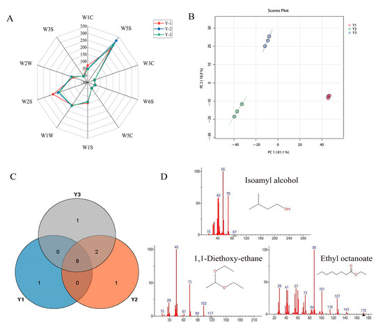 PCA analysis results of E-Nose are shown in Figure 1B. The contribution rates of PC1 and PC2 were 81.1% and 18.9%, respectively, with a total contribution rate of 100%; it can be concluded that the data accurately reflects the information in the samples as a whole. The three samples can be distinguished by E-nose, in which the overall information of Y2 and Y3 overlaps, indicating that their overall flavor was more similar. The distance between Y1, Y2, and Y3 indicated that Y1 had distinct flavor characteristics compared with the other two kinds. As can be shown, the E-nose can tell the three varieties of potato wine, but it cannot tell which VOCs are changing between them.