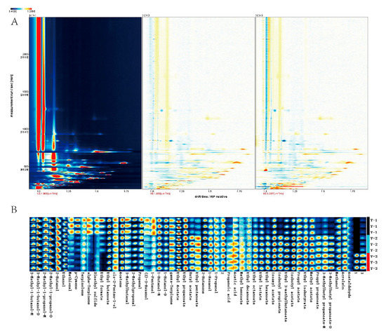 The retention time and migration time corresponding to the characteristic peaks of GC-IMS components can be used for VOCs, and the instrument can be standardized by the linear retention index (RI) of each volatile compound [18,22]. By comparing the standard RI and drift time (ms) in GC-IMS NIST library, the VOCs were qualitatively analyzed. The intensity of VOCs was obtained according to the peak volume, and the content of VOCs was proportional to the peak intensity.