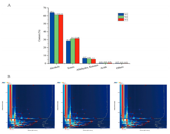 Table S4 shows that the three samples’ peak area intensities were in the following order: Y3 > Y2 > Y1, which indicated that the content of VOCs in potato wine was improved after ultrasonic and irradiation treatment, and the effect of GI was greater than that of US, which is consistent with the results of Jia et al. [10], who found a significant increase in the VOCs in the body of Fen-flavored liquor by γ-ray irradiation. The types of VOCs in the three samples remained constant, but their contents significantly altered (as shown in Table S4 and Figure 3A). A total of 2 acids, 8 aldehydes and ketones, 14 alcohols, 21 esters, and 5 other substances were detected. As shown in Figure 3A, compared with Y1, the relative contents of alcohols, aldehydes, and ketones in Y2 and Y3 decreased, while the relative contents of esters in Y2 and Y3 increased significantly.