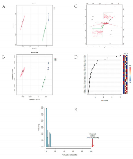 Figure 4. Multivariate analysis of aroma compounds in three potato wines based on GC–IMS; (A,B) are the 2D scores by PCA and PLS-DA, respectively; (C) is the loading plots analyzed by PCA, (D) is a graph of the VIP score for volatile compounds; (E) is a permutation plot tested 1000 times. The number is consistent with Table S4, Y1: newly produced potato wine; Y2: ultrasonic treated potato wine; Y3: gamma irradiated potato wine.