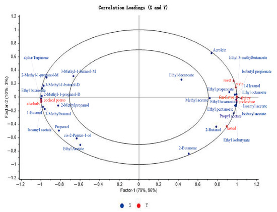 Figure 5. Correlation loading plot for aroma-active compounds (X-matrix) and aroma attributes of potato wines (Y-matrix). Blue and red represent the VOCs and aroma sensory properties, respectively.