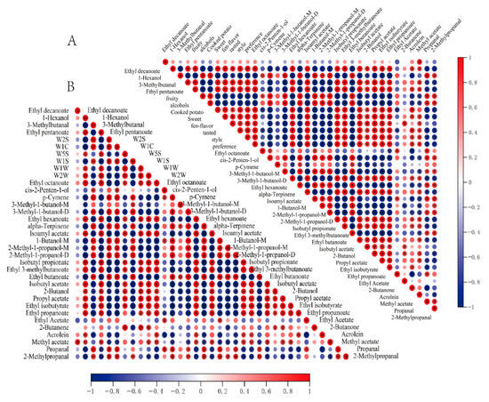 Figure 6. Pearson’s correlation analysis between the aroma-active compounds and aroma attributes (A), as well as the correlation between aroma-active compounds and E-nose (B). The large circle indicated a strong correlation, whereas the small circle indicated a weak correlation. The color bar denoted the R-value of the Pearson correlation, with 1 representing a perfect positive correlation (dark red) and −1 representing a perfect negative correlation (dark blue). The “*” in the circle indicated the aroma-active compounds were significantly correlated with the aroma attributes and E-nose (p < 0.05).