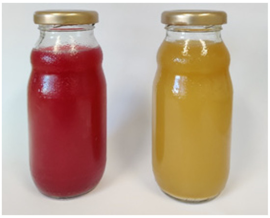 Apple juice in 100 mL glass bottles of cultivars ‘Baya Marisa’ (left) and ‘Golden Delicious’ (right).