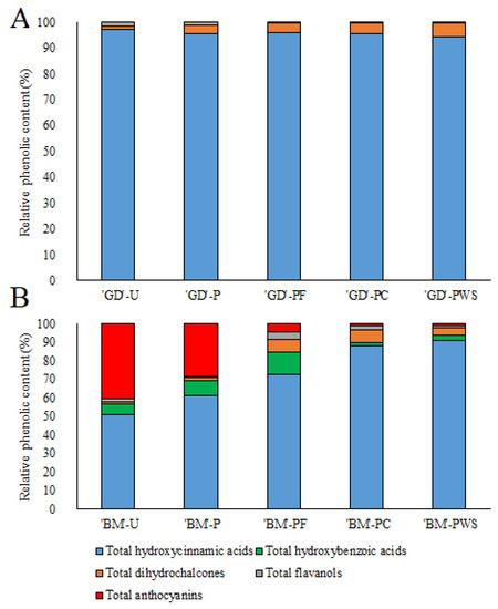 Identified phenolic compounds presented in relative content in fresh unpasteurized, pasteurized, and pasteurized and stored for one year apple (Malus domestica Borkh.) juice of ‘Golden Delicious’ (A) and ‘Baya Marisa’ (B). ‘BM’-U (‘Baya Marisa’ unpasteurized), ‘GD’-U (‘Golden Delicious’ unpasteurized), ‘BM’-P (‘Baya Marisa’ pasteurized), ‘GD’-P (‘Golden Delicious’ pasteurized), ‘BM’-PF (‘Baya Marisa’ pasteurized, refrigerator-stored), ‘GD’-PF (‘Golden Delicious’ pasteurized, refrigerator-stored), ‘BM’-PC (‘Baya Marisa’ pasteurized, unexposed to light), ‘GD’-PC (‘Golden Delicious’ pasteurized, unexposed to light), ‘BM’-PWS (‘Baya Marisa’ pasteurized, exposed to light), ‘GD’-PWS (‘Golden Delicious’ pasteurized, exposed to light).