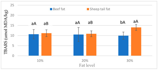 As shown in Figure 1, the fat type × fat level interaction was determined. The TBARS value for beef fat was similar at all fat levels. On the other hand, meatballs prepared with sheep tail fat had the highest TBARS value at 30% fat level, and the lowest TBARS value at 10% fat level. Furthermore, differences between fat types were not significant at 10% and 20% fat levels, and at the 30% fat level, sheep tail fat had a higher mean TBARS value than beef fat. According to these results, 30% sheep tail fat significantly increased lipid oxidation (Figure 1). This result is likely due to the fact that sheep tail fat contains more unsaturated fatty acids than beef fat [14].