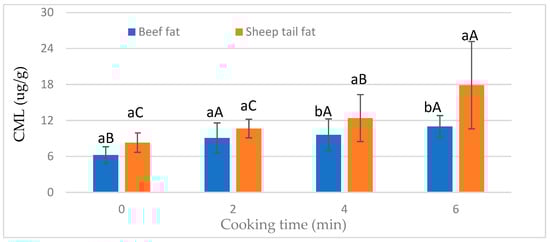 Effect of interaction of fat type and cooking time on the CML value of meatballs. a, b: different small letters indicate significant differences between fat type for cooking time. A–C: different capital letters indicate significant differences between cooking time for fat type.