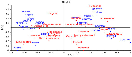 Among the volatile compounds, aldehydes showed a higher positive correlation with groups containing STF. Furthermore, meatballs with 20% and 30% BF cooked for 4 and 6 min, and meatballs containing 10, 20, and 30% STF cooked for 6 min were placed on the negative side of PC2 and showed a positive correlation with each other (Figure 3).