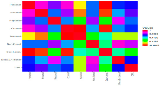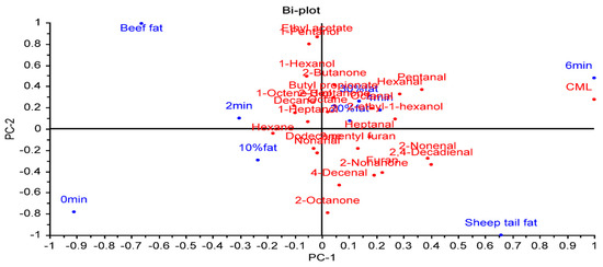 A PCA was applied to determine the relationships between fat type, fat level, cooking time, volatile compounds, and CML (Figure 4). The first PC explained 54% of the variation. PC2 accounted for 26% of the total variance. The first two principal components explained 80% of the total variance. CML showed a positive correlation with sheep tail fat, 20 and 30% fat levels, and a cooking time of 6 min. These factors were on the positive side of PC1. In contrast, beef fat, a 10% fat level, and 0 (raw) and 2 min cooking times were on the negative side of PC1, showing a negative correlation with CML. Although CML was more affected by cooking time, it was determined that fat level and fat type also had an effect on CML formation.