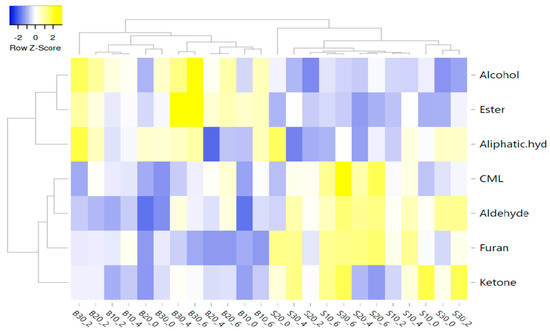 In this study, the correlation between factors, volatiles, and CML was also evaluated using a heat map (Figure 5). Average linkage was used as the clustering method and Pearson correlation was used as the distance measure to illustrate the heat map. The X and Y axes represent the factors (fat type, fat level, and cooking time), and volatile compounds groups and CML, respectively. Yellow and blue were used for higher and lower correlation coefficients, respectively.