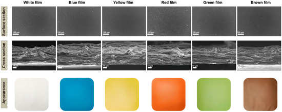 The surface and cross-section views of the original White film showed the penetration of chitosan between the cellulose and the formation of a dense fibrillar network (Figure 1). The natural pigments were found to be uniformly dispersed in the matrix, which resulted in the film surfaces being much rougher (Figure 1). In particular, the addition of lycopene resulted in the surface of the film having more particles and the presence of agglomerates, which may be due to the concentration used. The cross-section of the colorful films showed a layered structure and no significant changes compared with the White film after absorption of the pigments, which was consistent with a previous report [56].