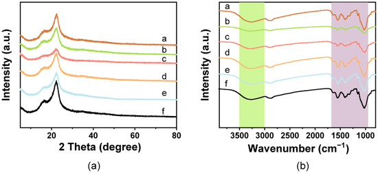 Structural characterization of the composite films. (a) FTIR spectra and (b) XRD patterns observed from the cellulose/chitosan film and cellulose/chitosan film with natural pigments. a: White film, b: Blue film, c: Yellow film, d: Red film, e: Green film, f: Brown film.