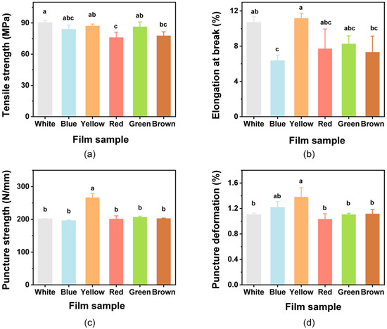 Mechanical properties of the composite films. (a) Tensile strength; (b) Elongation at break; (c) puncture strength; and (d) puncture deformation. Different lowercase letters above bars indicate significant differences (p < 0.05).