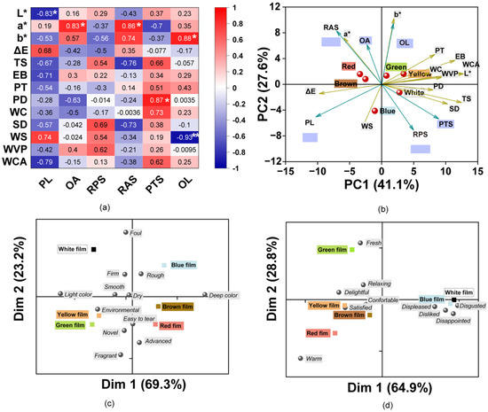 (a) Matrix of Pearson correlation coefficients for the physicochemical and sensory parameters. The color of the squares indicates the intensity of their correlation. (* indicates p < 0.05; ** indicates p < 0.01); (b) Biplot of the first two dimensions (F1 and F2) based on principal component analysis of the film samples and properties. Arrows show characteristics for divergence between composite films with different colors. The farther the characteristics are from the origin, the more essential for the differentiation of the film. PL: perceived lightness, OA: odor acceptation, RBS: roughness of air surface, RPS: roughness of plate surface, PTS: perceived tensile strength, OL: overall liking. (c,d) Biplot representation of the participants’ perceptions to films with descriptions for the first two dimensions (Dim 1 and Dim 2) of the correspondence analysis. (c) Features of the films; (d) emotions evoked by the films.