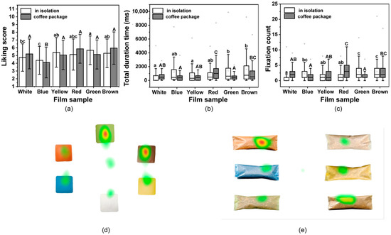Liking of the films determined was evaluated using the mouse click and eye-tracking data. (a) Mean liking scores for films in isolation and when used to pack coffee based on click data. (b) Boxplots showing the total duration time and (c) fixation counts for the participants gaze on pictures of films in isolation and when used to pack coffee. Different lowercase letters above bars indicate significant differences between films (p < 0.05); Different uppercase letters above bars indicate significant differences between films used in packed coffee (p < 0.05). Heatmaps for (d) films in isolation and (e) when films are used to pack coffee. Red areas indicate the highest gaze values, while green areas indicate low gaze values.