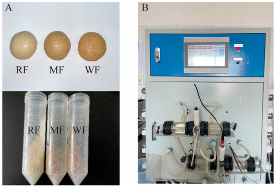 The experiments referred to and modified the in vitro fecal fermentation method of Yang et al. [28], where fermentation was carried out in an anaerobic incubator. Fermentation was carried out using basal medium (g/L): carbon source, tryptone (2.0), yeast extract (2.0), NaCl (0.1), K2HPO4 (0.04), KH2PO4 (0.04), MgSO4·7H2O (0.01), CaCl2·6H2O (0.01), NaHCO3 (2.0), heme chloride (0.025), vitamin K1 (0.002; filtered to remove microbiota), L-cysteine hydrochloride (0.5), bile salts (0.5), edged aspartame solution (0.25), and 0.01 (v/v) Tween 80. The medium had a pH of 6.8–7.0, and it was sterilized at 115 °C for 30 min. Two groups were designed: (1) freeze-dried samples of RF, MF, and WF digests were used as carbon sources (added at 0.5%, m/v) and fermented separately to screen the optimal carbon source; (2) the optimal carbon source was used as a variable and added at 0.5%, 1.0%, and 1.5% (m/v) to explore the effect of different additions on the intestinal microbiota.
