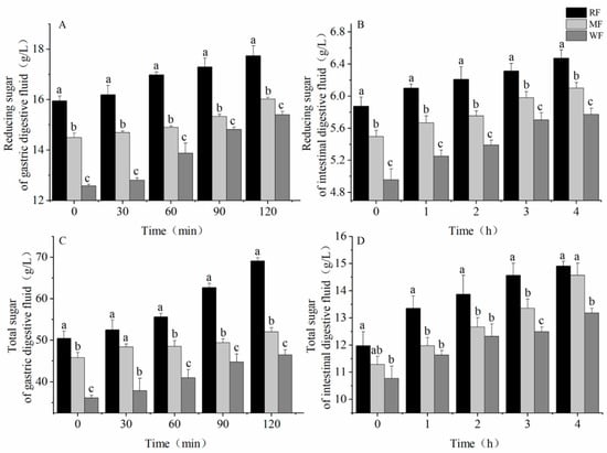 (A) Reducing sugar content after gastric digestion; (B) total sugar content after gastric digestion; (C) reducing sugar content after small intestine digestion; (D) total sugar content after small intestine digestion. Values are means ± SEM. Different letters indicate a significant (p < 0.05) difference using repeated-measures ANOVA and Tukey’s post hoc test.