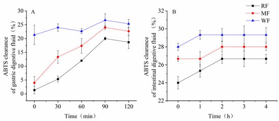 In the simulated small intestine digest, the scavenging rate of ABTS radicals generally showed an increasing trend from 0 h to 2 h and then stabilized after 2 h (Figure 3B). At 2 h, the scavenging of ABTS radicals by RF and MF digest was 26.7% and 28.0%, respectively, and the scavenging of ABTS radicals by WF digest was 29.3%, which was 1.1 times that of RF and 1.0 times that of MF.