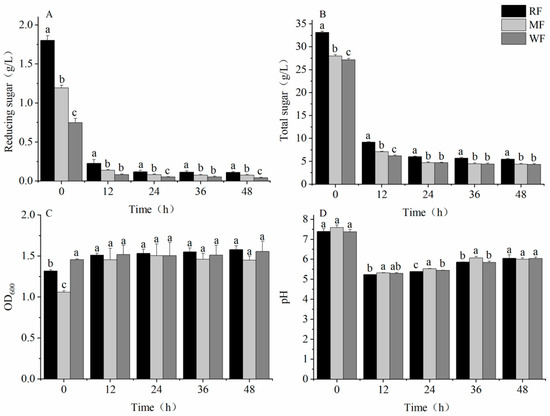 After 12 h of fermentation, the content of reducing sugars and total sugars decreased rapidly, and the consumption rate slowed down in the later stages of fermentation (Figure 4A,B). During the fermentation process, OD600 gradually increased (Figure 4C), and the pH first decreased, increased, and, finally, stabilized (Figure 4D). After 48 h of fermentation, the reducing sugar contents of the three types of flour were significantly different (p < 0.05), with WF having a reducing sugar content of 0.04 ± 0.010 g/L, which was a decrease of 63.4% and 46.1% compared with RF and MF, respectively. The total sugar content of RF was significantly different from that of MF and WF, with WF having a total sugar content of 4.3 ± 0.168 g/L, which was a decrease of 21.3% and 1.8% compared with RF and MF, respectively. However, OD600 and pH were not significantly different among RF, MF, and WF, with OD600 values of 1.6 ± 0.047, 1.4 ± 0.051, and 1.6 ± 0.127 and pH of 6.1 ± 0.177, 6.0 ± 0.071, and 6.0 ± 0.071, respectively.