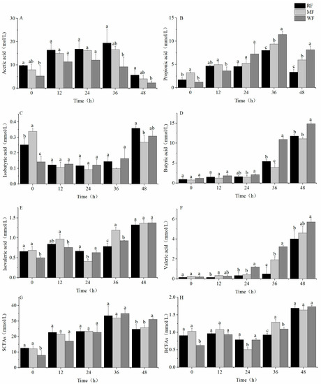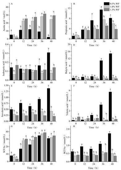 Production of SCFAs at different additions of WF. (A) Acetic acid; (B) propionic acid; (C) isobutyric acid; (D) butyric acid; (E) isovaleric acid; (F) valeric acid; (G) SCFAs; (H) BCFAs. Values are means ± SEM. Different letters indicate a significant (p < 0.05) difference using repeated-measures ANOVA and Tukey’s post hoc test.