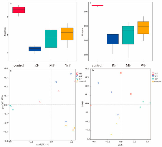 α-diversity and β-diversity of the intestinal microbiota; (A) Shannon indices; (B) Simpson indices; (C) weighted unifrac-distance-based PCoA; (D) weighted unifrac-distance-based NMDS. PCoAs 1 and 2, MDS1 and 2 represent the major axes of variation among objects in a 2D space. Each dot in the graph represents a sample, and dots of different colors indicate different groups. The percentages in the coordinate brackets represent the proportions of the sample variance data (the distance matrix) that the corresponding coordinate axis can interpret.