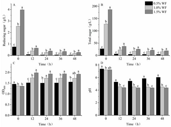 Changes in each parameter after in vitro fecal fermentation of WF at different additions. (A) Reducing sugar content; (B) total sugar content; (C) OD600; (D) pH. Values are means ± SEM. Different letters indicate a significant (p < 0.05) difference using repeated-measures ANOVA and Tukey’s post hoc test.