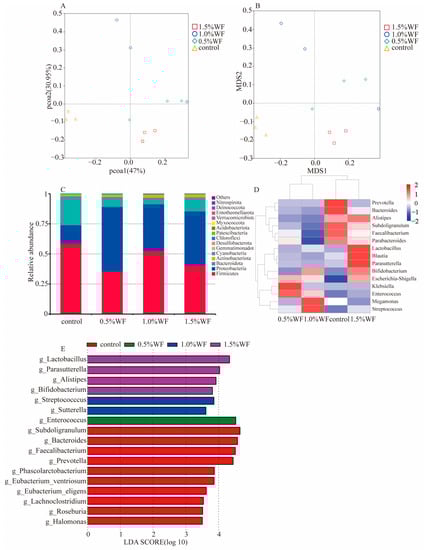 The α-diversity among different WF additions was not significant, and only the β-diversity showed significant results. As shown in the PCoA and NMDS plots (Figure 10A,B), the distance between different additions of WF samples and control samples was far. The three samples at 1.5% WF addition were more tightly clustered compared with those at 0.5% and 1.0% WF. At the phylum level, the dominant groups in each group were Firmicutes, Proteobacteria, Bacteroidota, and Actinobacteriota (Figure 10C). Proteobacteria accounted for over 38.8% of the microbiome. The relative abundance of Bacteroidota at different WF additions was 8.2%, 5.4%, and 11.7%, indicating that 1.5% WF significantly promoted the growth of Bacteroidota. At the genus level, 1.5% WF significantly inhibited the growth and reproduction of potentially pathogenic microbiota, such as Streptococcus, Enterococcus, Klebsiella, and Prevotella, compared with 0.5% and 1.0% WF additions (Figure 9D). Moreover, 1.5% WF had the highest clusters of the most beneficial microbiota, including Bifidobacterium (1.8%), Parasutterella (2.5%), Blautia (7.2%), Lactobacillus (4.5%), Parabacteroides (2.7%), Subdoligranulum (7.5%), Alistipes (2.6%), and Bacteroides (4.5%), among others.