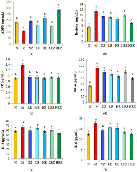 3.7. Effect of EP and Its Zn Complex on Adipokines and Inflammatory Factors in Mice