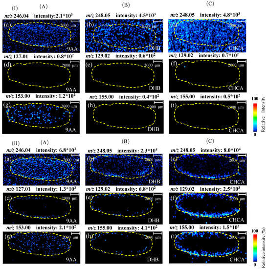 Representative ion images of forchlorfenuron in oriental melon sections in control group (I) and treatment group (II) by MAIDL-MSI with different matrices. (A) 9AA in the positive mode. (a) precursor ion. (d) product ion 1. (g) product ion 2. (B) DHB in positive ion mode. (b) Precursor ion. (e) product ion 1. (h) product ion 2. (C) CHCA in positive ion mode. (c) Precursor ion. (f) product ion 1. (i) product ion 2.