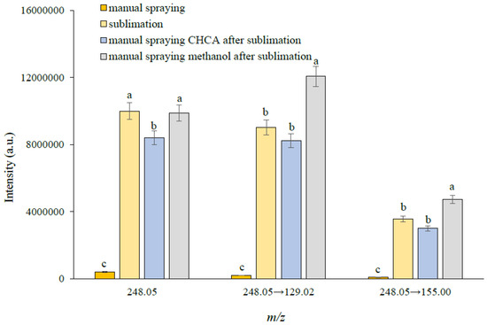 Comparison of detection sensitivities of forchlorfenuron after different matrix coating modes; forchlorfenuron standard solution (1 µL, 100 mg/L) was deposited on the blank oriental melon section (n = 3). Bars that do not share similar letters denote statistically significant differences (p < 0.05) determined by a pairwise t-test with Bonferroni-adjusted p-values.